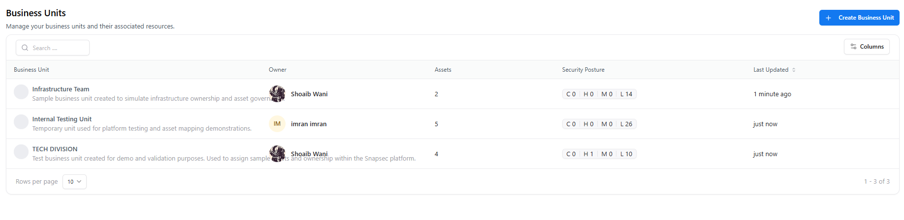 Snapsec connects discovered assets directly to business units and responsible teams, ensuring that exposure is always tied to an accountable owner.