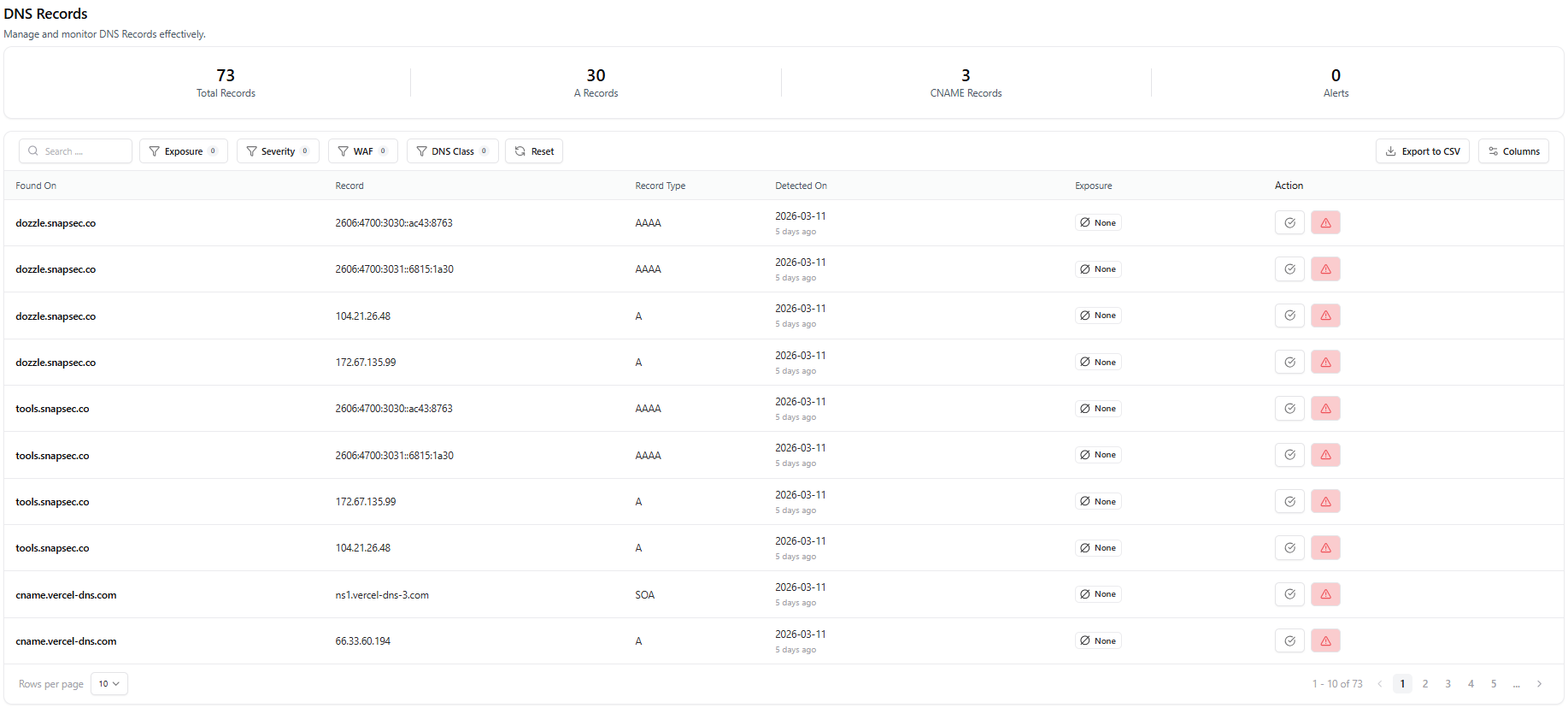 Snapsec continuously tracks DNS activity across the organization’s domains, providing visibility into: