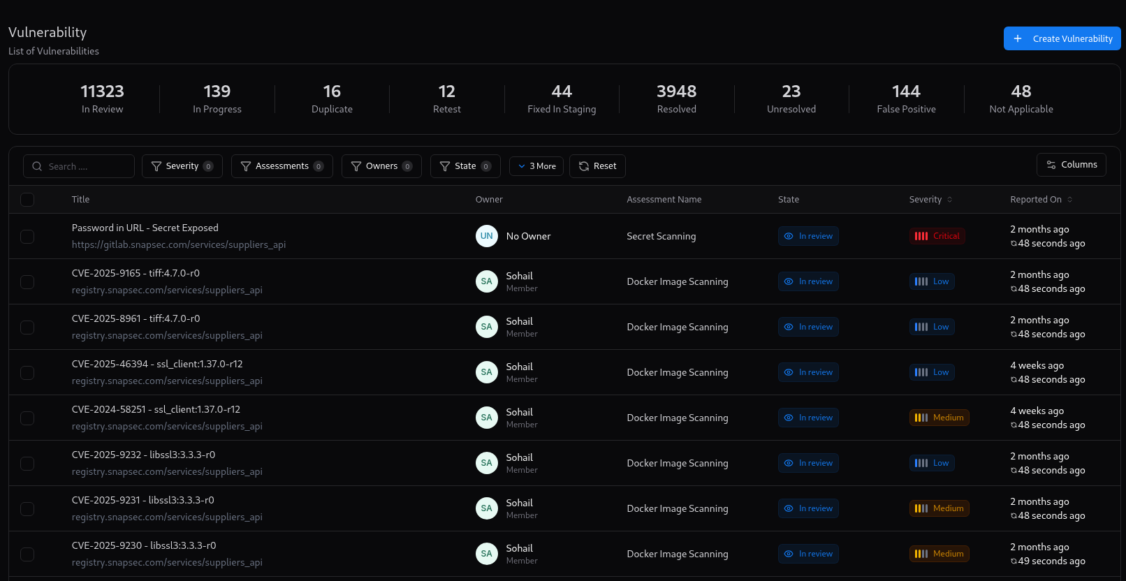 Snapsec’s Vulnerability Management (VM) moves beyond raw vulnerability counts to risk-based prioritization, correlating findings across infrastructure, applications, and attack surface context.